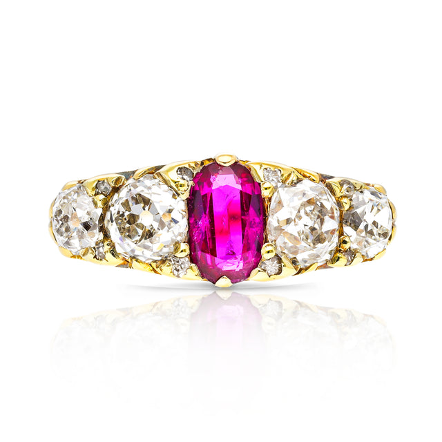 Victorian, oval-cut Burmese ruby & diamond five-stone engagement ring