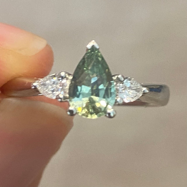 Pear-cut teal sapphire & diamond three-stone engagement ring