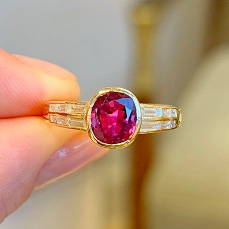 A bright diamond-set centre and exciting frame of rubies, obsessed!