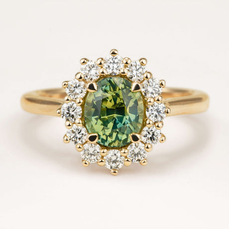 Oval-cut Green sapphire and diamond cluster engagement ring