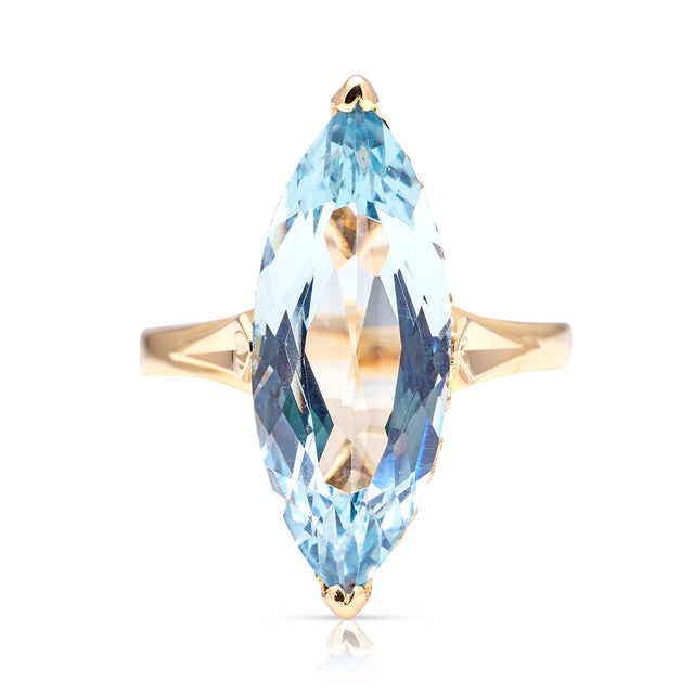 Set with a 3ct marquise-cut light blue aquamarine, claw-set in 18ct yellow gold, the mount is decorated with an ornately gallery. This ring has French hallmarks on the outside of the band, indicating 18ct yellow gold. Circa 1900. A simple ring that makes a statement.