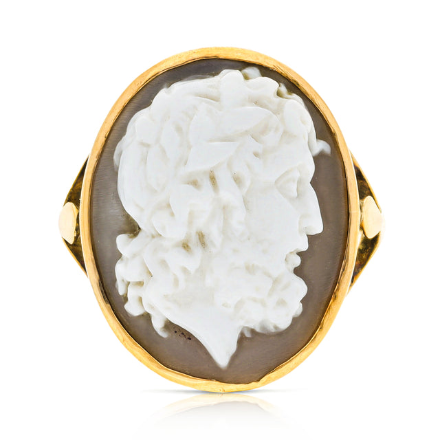 A Georgian carved cameo ring. The cameo is carved in agate and secured in an 18ct yellow gold rub-over setting. Tri-split shoulders complete this Georgian ring.