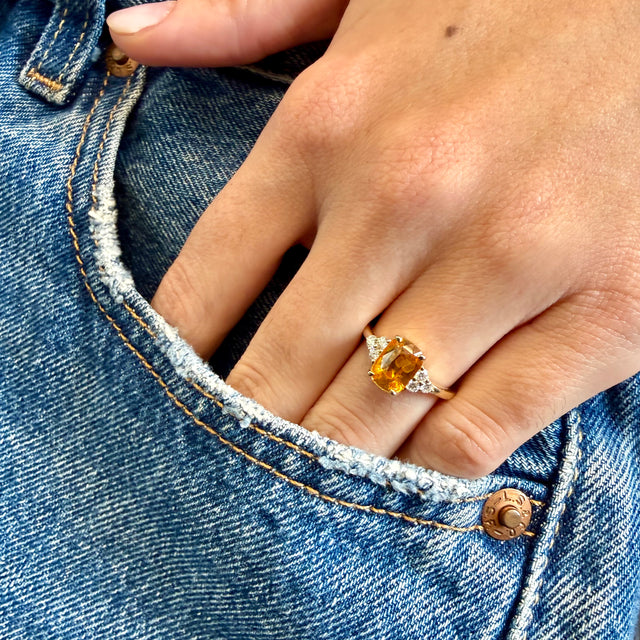 Orange cushion-cut sapphire and diamond cluster tre-foil ring