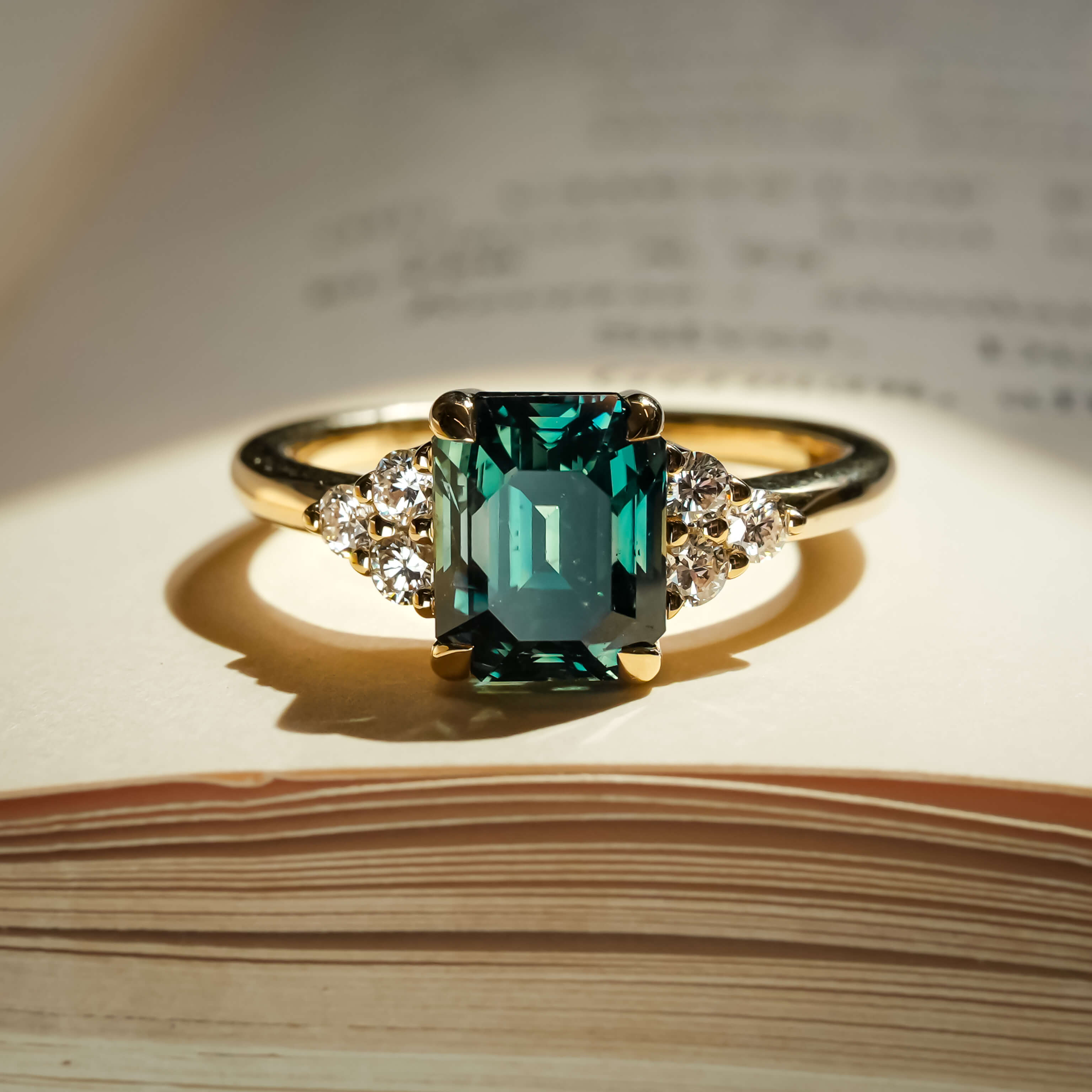 The setting has been expertly crafted by our workshop, with each stone personally selected by Sam for its exceptional quality and distinctive colour. The natural unheated teal sapphire was discovered during our travels in search of the world’s finest gemstones.