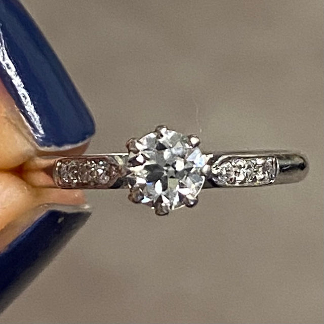 Originating from the United Kingdom, this piece dates to the 1920s.  A central diamond partnered with six additional diamonds set into the shoulders.